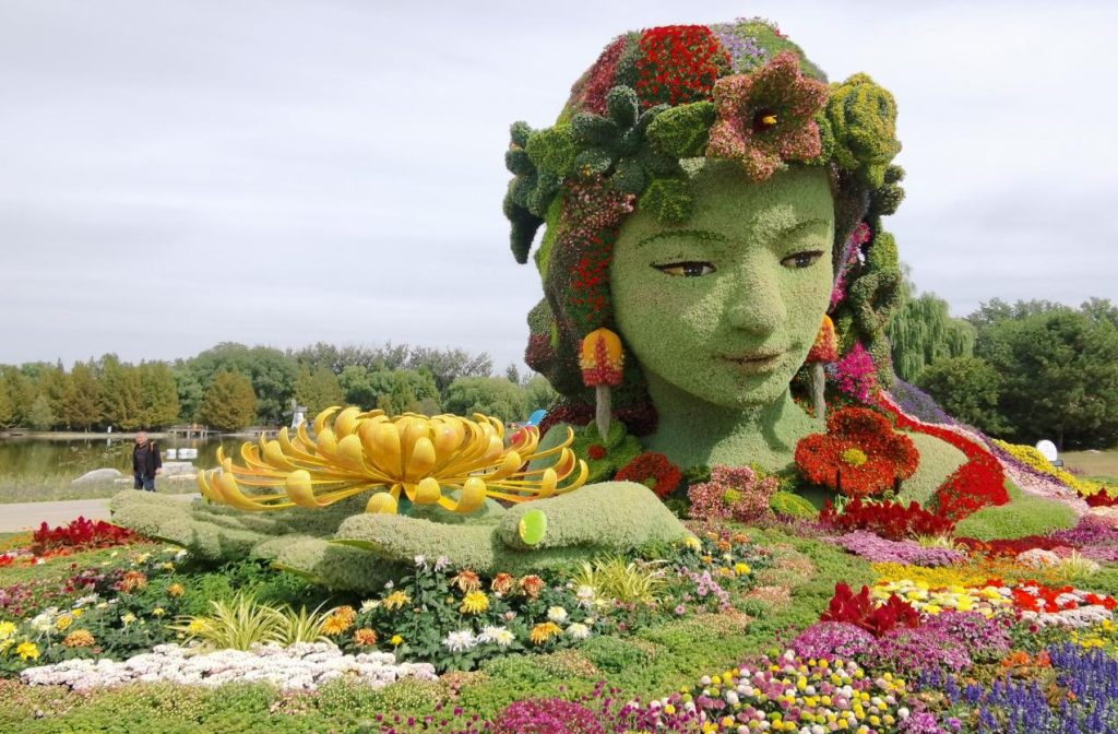 园区内23处网红打卡装置也将在国庆期间以最美姿态迎接游客。莫兰迪色调的“风漾花谱”风车充满异域风情,粉色系“浪漫满屋”花房充满温馨浪漫,蓝紫花海中的“云端漫步”云梯仿佛通往梦幻仙境,时空旅行中的悠乐园童年系列作品勾起人们美好的回忆。而巨型“花神归家”立体花坛更是成为园区焦点,繁花装点的头饰、如瀑的花发与菊花地摆相互呼应,让游客们深切感受花神与菊韵的交融之美,纷纷驻足拍照留念。